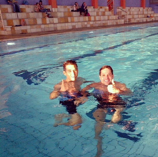 사진은 부상에서 서서히 회복 중인 두 선수가 물 속에서 재활 치료를 하고 있는 장면으로 추측된다.