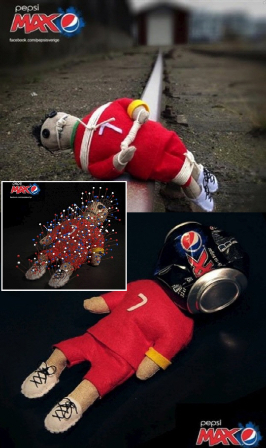 세계적인 콜라 브랜드 '펩시'가 크리스티아누 호날두에게 저주를 퍼부은 사진을 버젓이 게재해 파문이 일고 있다.