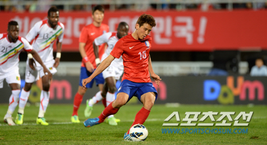 홍명보 감독이 이끄는 축구대표팀이 15일 천안종합운동장에서 말리와 친선경기를 가졌다. 전반 구자철이 페널티킥으로 동점골을 터뜨리고 있다. 천안=허상욱 기자 wook@sportschosun.com