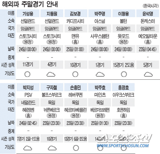 손흥민(21·레버쿠젠) 역시 '맑음'이다. 제대로 발동이 걸렸다. A대표팀 합류 전에 치른 친정팀 함부르크와의 맞대결에선 해트트릭을 폭발시키면서 분데스리가 주간 베스트11에 포함됐다. 동료와의 협력 플레이 뿐만 아니라 개인 기량도 완연한 상승세다. 러시아전이 열린 아랍에미리트(UAE) 두바이에서 곧장 레버쿠젠으로 날아간 손흥민은 23일 독일 베를린의 올림피아 스타디온에서 열릴 헤르타 베를린과의 리그 13라운드 출격을 준비 중이다. 기성용(24)은 승부처에 들어갔다. A대표팀 합류 직전 2경기 연속 선발로 거스 포옛 감독의 마음은 어느 정도 잡았다. 패스 축구로 변화 중인 선덜랜드 전력의 중심축으로 서서히 자리를 잡아가고 있다. A매치 참가로 인한 피로 누적이 변수다. 24일 브리타니아 스타디움에서 열릴 스토크시티와의 프리미어리그(EPL) 16라운드 출격에 도전한다. 이밖에 팀 내 입지를 어느 정도 다진 박주호(26·마인츠) 홍정호(23·아우크스부르크)도 주말 리그전에 선을 보일 전망이다.