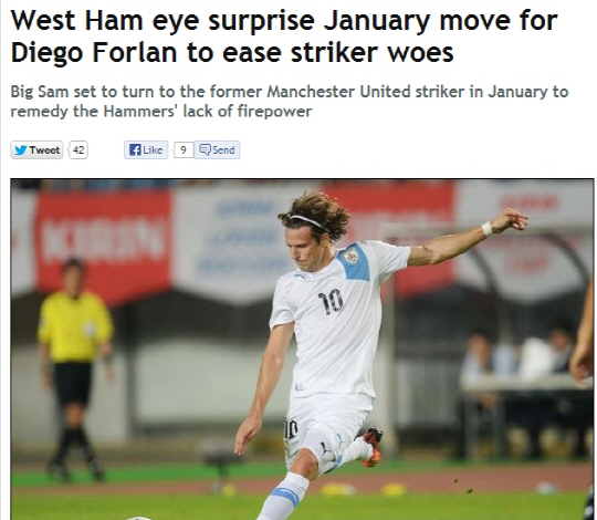 22일(한국시각) 영국 일간지 데일리미러는 웨스트햄이 1월이적시장에서 포를란의 영입을 노리고 있다고 보도했다. 샘 알라디스 웨스트햄 감독은 앤디 캐롤의 부상이 장기화되고 공격수 보강을 노리고 있다. 포를란은 지난해 남미로 복귀하며 변함없는 득점력을 보이고 있지만, 유럽 복귀를 원하고 있다. 포를란은 풍부한 국제무대에, 맨유를 통해 잉글랜드 무대를 경험했다는 장점이 있다.