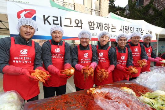 프로축구연맹(총재 권오갑, 이하 '연맹')이 22일 김장에 나섰다. 사회공헌활동의 일원으로 서울시 관악구 남현동 소재 상록보육원에서 열린 'K-리그와 함께하는 사랑의 김장 나눔' 행사에서 연맹 임직원들은 이웃사랑을 실천했다. 권오갑 총재와 신태용, 유상철, 이운재 K-리그 홍보대사들이 참석했다.