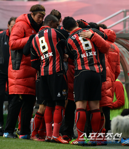 FC서울과 부산 아이파크의 2013 K리그 클래식 경기가 24일 서울월드컵경기장에서 열렸다. 전반 서울 데얀이 선취골을 터뜨린 후 동료들과 함께 경기 중 실신하며 교체된 몰리나를 찾아 격려하고 있다. 상암=허상욱 기자 wook@sportschosun.com/2013.11.24/