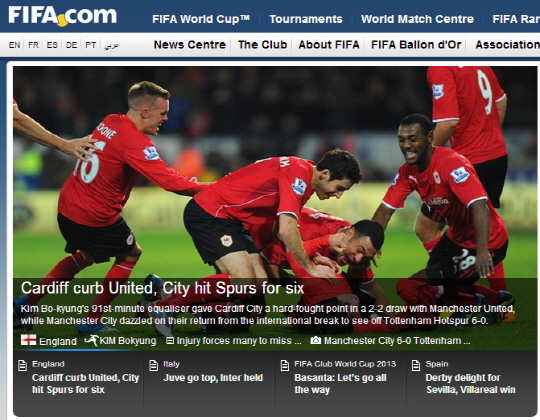 FIFA는 25일(한국시각) 공식 홈페이지에 '카디프가 맨유를 잡았다'고 소식을 전했다. 그러면서 '한국 미드필더 김보경이 경기 종료 직전 극적인 동점골로 팀에 무승부를 선사했다. 맨유는 김보경의 헤딩골에 의해 4위 진입에 실패했다'고 덧붙였다.