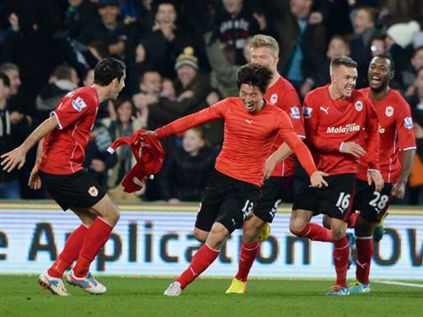 ◇김보경(가운데)이 25일(한국시각) 카디프시티 스타디움에서 열린 맨유와의 2013~2014시즌 프리미어리그 12라운드에서 후반 추가시간 헤딩 동점골을 터뜨린 뒤 상의를 탈의한 채 그라운드를 질주하는 모습. 사진출처=카디프시티 구단 홈페이지