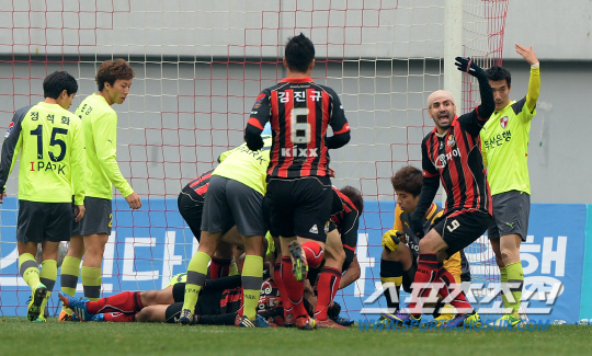 FC서울과 부산 아이파크의 2013 K리그 클래식 경기가 24일 서울월드컵경기장에서 열렸다. 서울 몰리나가 전반 볼다툼 중 부산 김응진과 볼다툼 중 정신을 잃고 그라운드에 쓰러지자 선수들이 다급한 모습으로 상태를 살펴보고 있다. 상암=허상욱 기자 wook@sportschosun.com/2013.11.24/
