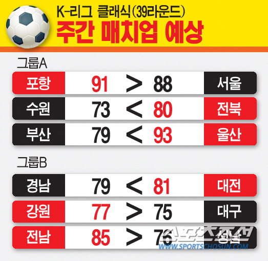 랭킹 지수에서도 현실이 그대로 반영됐다. 울산(93점), 부산(79점)의 점수 차는 컸지만, 포항(91점)과 서울(88점)의 격차는 3점에 불과했다. 39라운드에서 우승팀이 결정되지 않으면 공교롭게도 두 팀은 최종전에서 맞붙는다. 포항이 울산 원정길에 오른다. 모 아니면 도다. 포항이 대반전을 노릴 수 있다.