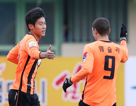 | ◇최승인(왼쪽)이 27일 강릉종합운동장에서 열린 대구와의 2013년 K-리그 클래식 39라운드에서 후반 40분 극적인 동점골을 성공시킨 뒤 동료 웨슬리의 축하를 받고 있다. 사진제공=강원FC |