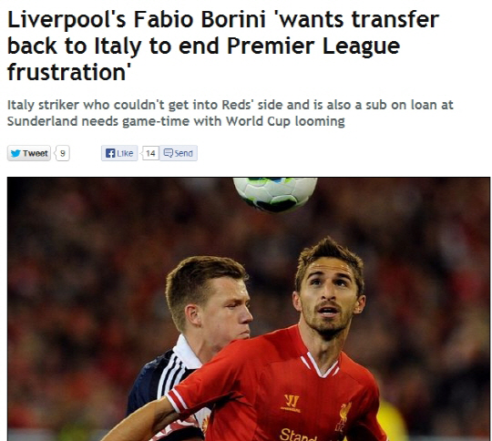 선덜랜드의 공격수 파비오 보리니가 자국 복귀를 희망했다. 보리니는 2012년 여름 1000만파운드에 AS로마를 떠나 리버풀로 이적했다. 기대와 달리 잦은 부상으로 제 몫을 하지 못했다. 리버풀은 보리니를 선덜랜드로 임대시켰다. 그러나 보리니는 선덜랜드에서도 자리를 잡지 못했다. 잉글랜드에서 악몽이 이어지다보니 고국 생각이 간절해 보인다.