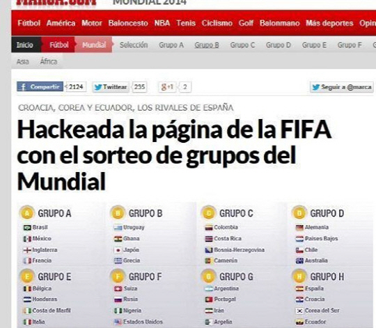 26일(현지시간) 스페인 언론 마르카는 "해커그룹이 국제축구연맹(FIFA) 서버에 침투해 2014 브라질 월드컵 조추첨 결과에 대한 정보를 얻어냈다"고 보도했다.