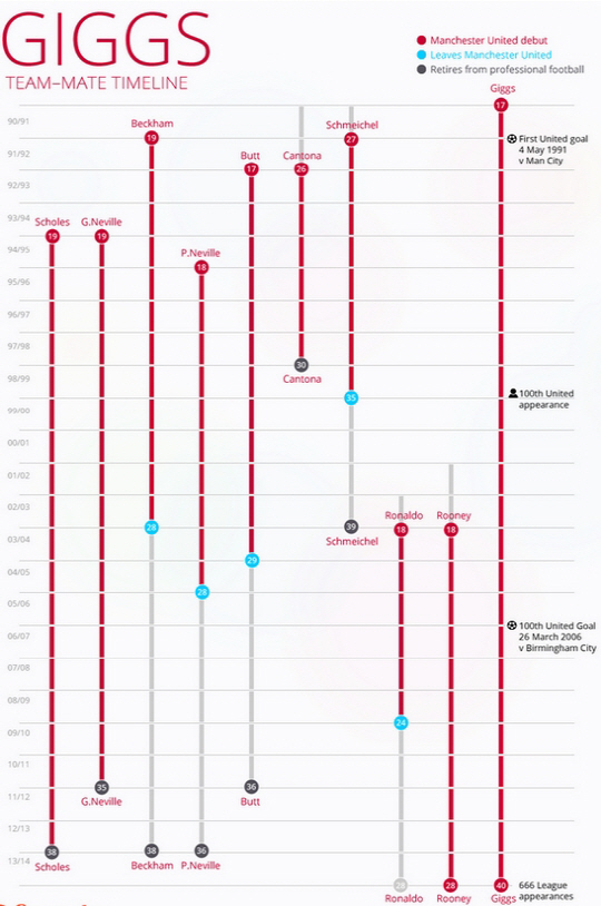 그래픽은 긱스가 맨유의 전성기를 함께 일궜던 동료들을 하나 둘 씩 떠나보내며 홀로 주전으로 버티고있는 긴 시간의 흐름을 보여준다.