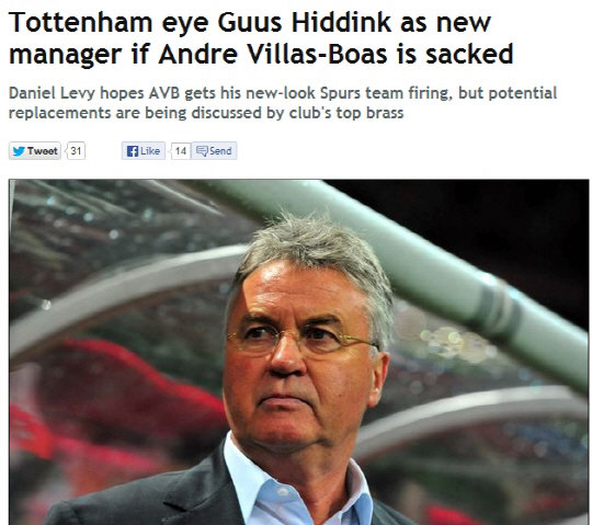 1일(한국시각) 영국 일간지 데일리미러는 토트넘이 안드레 비야스 보아스 감독을 경질할 경우 히딩크에게 지휘봉을 맡길 계획이라고 보도했다. 이 언론은 리딩크 뿐만 아니라 지난시즌 바이에른 뮌헨에서 트레블을 달성한 유프 하인케스도 후보에 올랐다고 전했다.