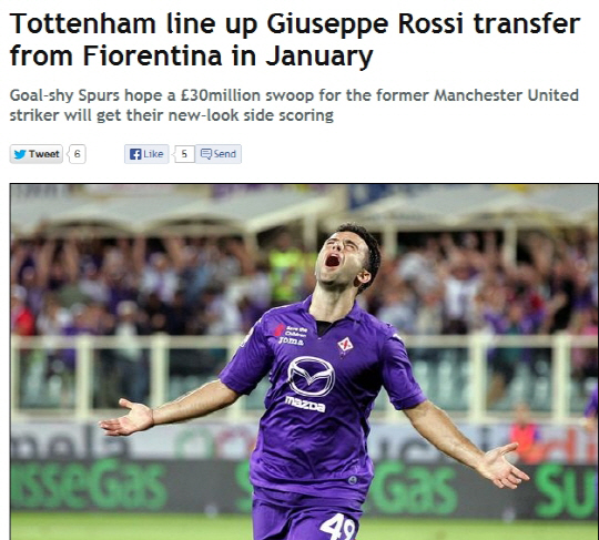 1일(한국시각) 영국 주간지 선데이피플은 토트넘이 피오렌티나의 공격수 주세페 로시 영입을 위해 3000만파운드를 준비했다고 보도했다. 토트넘은 올여름 무려 1억1000만파운드를 들여 공격진을 재편했지만 효과는 미비하다. 최근 맨시티에 0대6 충격패를 당하는 등 안드레 비야스 보아스 감독의 경질설까지 나오고 있다. 토트넘의 가장 큰 문제는 득점력이다. 프랑코 발디니 기술 이사는 골가뭄을 해소하기 위해 1월이적시장에서 수준급의 공격수를 데려온다는 계획이다.