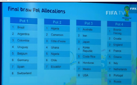 FIFA는 4일(한국시각) 브라질의 코스타도 사우이페에서 월드컵 조직위원회 회의를 열고 포트를 분류했다. 톱시드 국가들이 포진한 포트1을 제외한 포트 2~4의 구성이 완료됐다. 한국이 속한 아시아는 포트 3로 분류됐다. 아시아 4개국(한국 일본 이란 호주)과 북중미 4개국(미국 코스타리카 온두라스 멕시코)이 들었다. 포트 2에는 남미 나머지 2개국(칠레, 에콰도르)과 아프리카 5개국(알제리 카메룬 코트디부아르 가나 나이지리아)이 속했다. 포트4에는 나머지 유럽 9개국(크로아티아 잉글랜드 프랑스 그리스 이탈리아 네덜란드 포르투갈 러시아 보스니아-헤르체고비나)이 이름을 올렸다. 문제는 포트4에 9개국이 자리하고 있다는 것이다.