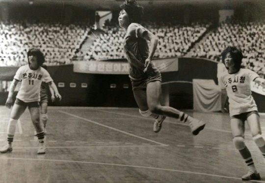 ◇장천신씨(가운데)는 1970~1980년대 한국 여자 핸드볼을 국제 무대로 이끈 스타 선수 출신이다. 현역시절 장 씨의 플레이 모습. 사진제공=김원일
