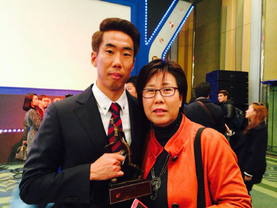 ◇3일 서울 홍은동 그랜드힐튼호텔에서 열린 2013년 K-리그 대상에서 클래식 베스트11 수비부문을 수상한 김원일(왼쪽)이 어머니 장천신씨와 포즈를 취하고 있다. 사진제공=김원일