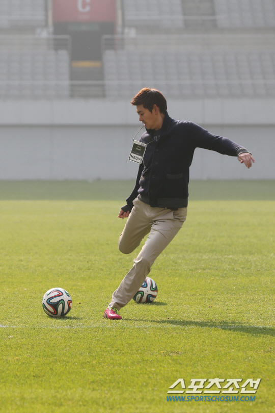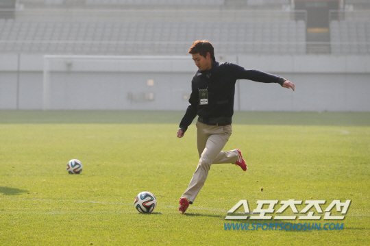 4일 서울월드컵경기장에서 열린 '아디다스 2014년 브라질월드컵 공인구 공개 행사'에서 스포츠조선 김진회 기자가 직접 '브라주카'를 직접 차보고 있다.