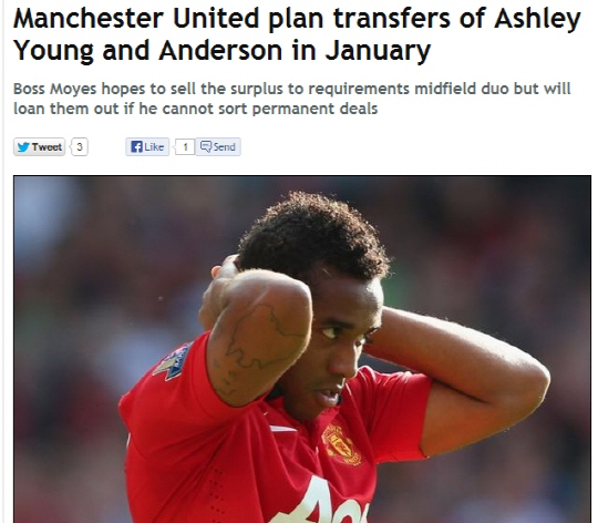 5일(한국시각) 영국 일간지 데일리미러는 맨유가 1월이적시장에서 애슐리 영과 안데르손을 정리할 것이라고 보도했다. 모예스 감독은 완전 이적을 선호하지만, 임대도 가능하다는 입장이다. 영은 모예스 감독의 신임을 받았지만, 지난 맨시티전(1대4 맨유 패) 이후 출전기회를 잡지 못하고 있다. 안데르손 역시 모예스 감독에 좋은 인상을 심어주지 못했다. 모예스 감독은 이들을 팔아 영입자금을 마련할 계획이다.