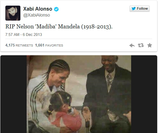 빈센트 콤파니는 '당신이 이 세상에 가져다준 좋은 것들을 묘사할 단어가 없다. 당신을 보내게 돼 슬프다. 내가 영감을 주는 유일하고 영원한 영웅'이라고 썼다. 애런 램지는 '이렇게 슬픈 뉴스가 있을까, 엄청난 영감을 주고 떠난 위대한 사람'이라고 말로 고인을 추모했다. 사비 알론소 역시 만델라와 함께 찍은 사진을 트위터에 올리며 고인을 추억했다. 토트넘, 맨유 등 프리미어리그 구단들 역시 만델라의 죽음에 깊은 슬픔을 표했다. 스포츠2팀