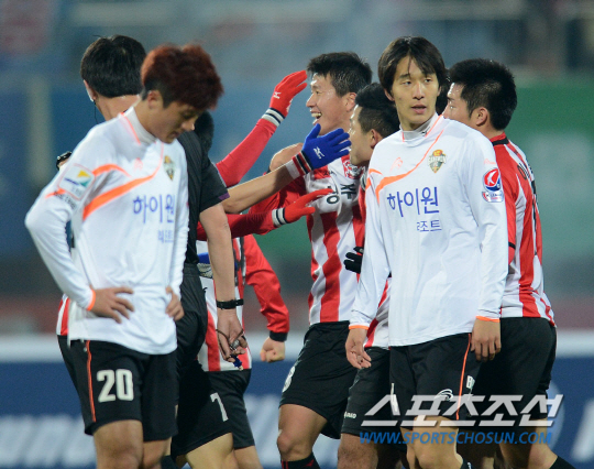 | ◇강원 선수들이 4일 상주종합운동장에서 가진 상주와의 2013년 K-리그 승강플레이오프 1차전에서 실점 뒤 허탈해 하고 있다. 상주=정재근기자 cjg@sportschosun.com |
