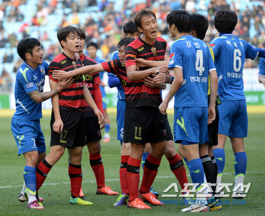 포항이 K리그 클래식 2013 최강자에 올랐다. 1일 울산 문수경기장에서 열린 울산과 포항의 2013 K리그 클래식 경기에서 후반 종료직전 김원일의 극적인 결승골로 1대0 승리를 거두며 21승11무6패(승점 74)를 기록, 선두 울산(승점 73)을 승점 1점차로 꺾고 K-리그 정상에 등극했다. 후반 종료직전 양팀 선수들이 신경전을 벌이고 있다. 울산=허상욱 기자 wook@sportschosun.com