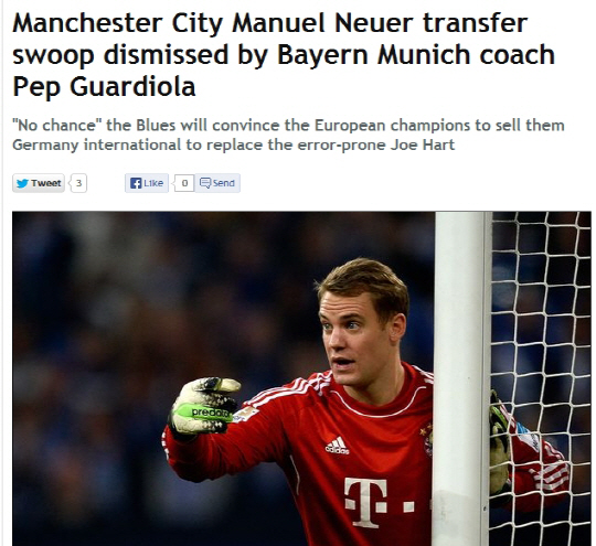 호셉 과르디올라 바이에른 뮌헨 감독이 마누엘 노이어의 이적설을 일축했다. 맨시티는 조 하트의 부진이 이어지며 골키퍼 보강을 원하고 있다. 세계 최고의 골키퍼 중 한명으로 평가받는 노이어가 물망에 올랐다. 최근 영국 언론에 따르면 맨시티는 노이어를 위해 4000만파운드까지 투자할 의향이 있는 것으로 알려졌다. 과르디올라 감독은 10일(한국시각) 영국 일간지 데일리미러를 통해 노이어의 이적설을 무시했다.그는 "생각하는 기회는 없을 것이다"고 했다.