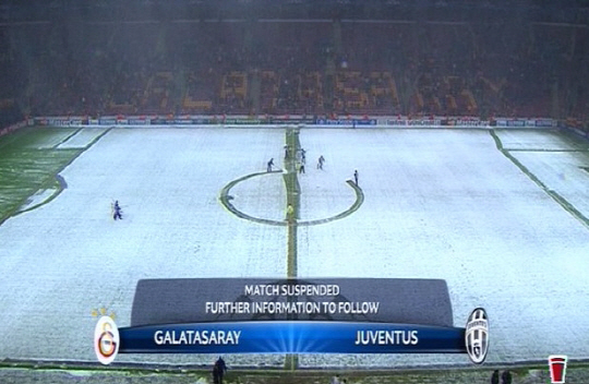UEFA는 홈페이지를 통해 '갈라타사라이와 유벤투스의 경기는 폭설로 인해 중단됐다. 운동장이 플레이를 할 수 없는 상황이었다'고 공지했다. 경기는 현지시각 수요일 낮 12시에 재개될 예정이다. 레알마드리드가 코펜하겐에 2대0으로 승리하며 조1위 16강을 확정지은 가운데 2위 유벤투스(승점 7), 3위 갈락타사라이(승점 5) 마지막 16강 티켓 전쟁을 펼친다. 유벤투스는 비기기만 해도 되지만, 갈락타사라이는 무조건 승리가 필요하다. 스포츠2팀