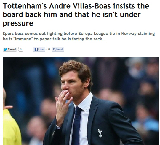 토트넘은 16일(한국시각) 비야스-보아스 감독과 상호 합의 하에 계약을 해지했다고 발표했다. 토트넘은 하루 전 안방인 화이트하트레인에서 리버풀에 0대5로 대패하는 수모를 당했다. 비야스-보아스 감독은 리버풀전을 마친 뒤 해임의사를 묻는 질문에 "그건 내가 결정할 일"이라고 불편한 심기를 드러낸 바 있다. 그러면서 "토트넘은 4강 전력이지만, 그에 걸맞는 실력을 발휘하지 못하고 있을 뿐"이라며 낙관적인 전망을 했다. 하지만 토트넘 경영진은 지난달 맨시티전 0대6 대패에 이어 리버풀전에도 패한 비야스-보아스 감독과 결별하는 쪽을 택했다.