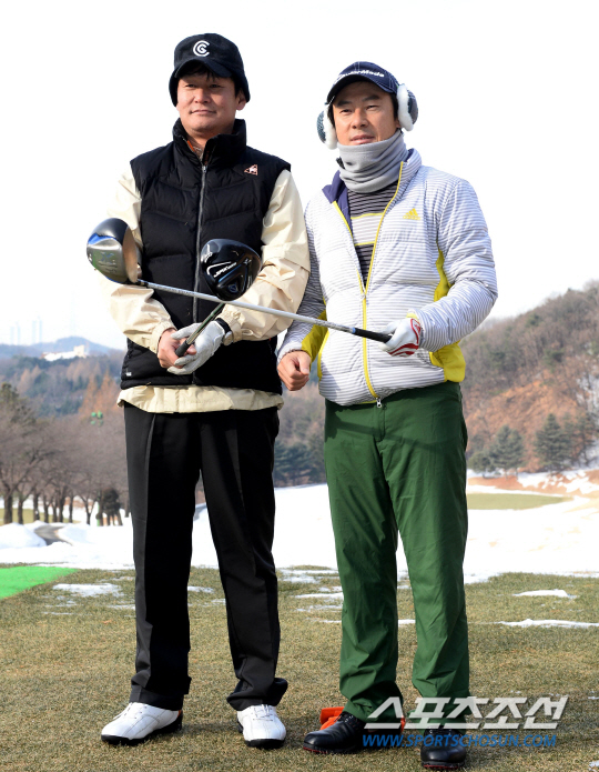 17일 오전 용인 골드컨트리클럽에서 열린 축구인 자선 골프대회에서 FC서울의 최용수 감독과 신태용 감독이 기념촬영을 하고 있다. 용인=송정헌 기자 songs@sportschosun.com/2013.12.17/