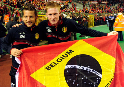 ◇벨기에 대표팀의 데브루인과 메르텐스가 팬들로부터 건네받은 응원걸개를 받아 포즈를 취하고 있다. 사진출처=벨기에축구협회 홈페이지