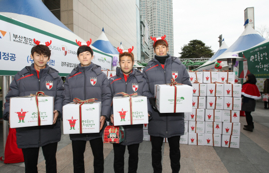 프로축구 부산 선수들이 소외계층 아동들에게 줄 행복한 크리스마스 선물을 포장했다.