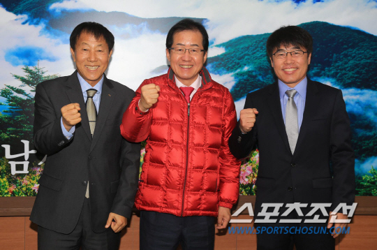◇경남FC의 구단주인 홍준표 경남도지사가 새롭게 선임된 이차만 감독(왼쪽), 이흥실 수석코치와 상견례 후 재도약을 다짐하며 파이팅을 외치고 있다. 사진제공=경남FC