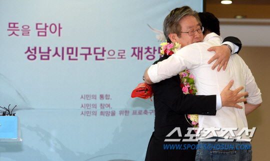 ◇이재명 성남시장이 지난 10월 2일 경기도 성남시청에서 성남시민구단 인수 및 재창단을 발표했다. 긴급 기자회견 직후 서포터 대표 김재범씨가 감사의 꽃다발을 전달했다. 꽃다발 전달 후 이 시장과 진한 포옹을 나누며 감격의 눈물을 쏟았다. 성남=허상욱 기자 wook@sportschosun.com