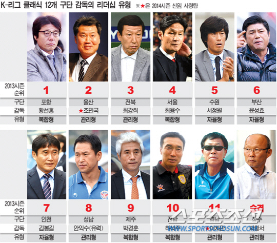 K-리그 클래식은 내년 12개 구단으로 운영된다. 강원, 대구, 대전이 2부 리그로 강등됐다. 상주 상무가 클래식으로 승격됐다. 최고령인 이차만 경남 감독부터 최연소인 최용수 서울 감독(42)까지…, 스타일은 각양각색이다. 내년 시즌 60대 감독이 1명, 50대가 5명, 40대가 6명이다. 감독의 리더십 성향에 따라 팀의 방향이 결정된다. 12개 구단 감독의 색깔은 어떤 그림일까.
