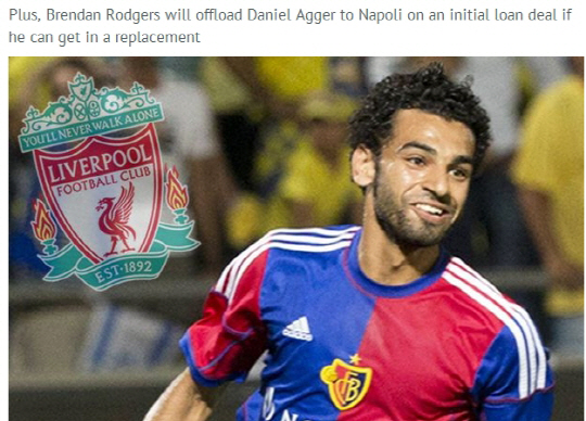 26일(한국시각) 영국 일간지 데일리미러는 리버풀이 바젤에서 좋은 모습을 보이고 있는 모하메드 살라의 영입에 근접했다고 보도했다. 살라는 올시즌 유럽챔피언스리그에서 맹활약을 펼치고 있다. 특히 첼시전에서 2번이나 골을 넣으며 잉글랜드 프리미어리그 클럽들의 주목을 받았다. 전력 보강을 노리는 브렌단 로저스 리버풀 감독은 살라의 다재다능함에 주목했다. 살라는 공격 어디에서도 제 플레이를 할 수 있다. 살라의 이적료는 700만파운드로 예상된다.