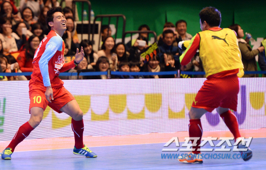 홍명보 장학재단이 주최하는 자선축구대회 '쉐어 더 드림 풋볼 매치 2013'이 29일 잠실실내체육관에서 열렸다. 올해로 11회째를 맞은 자선 축구대회는 해외리그 올스타로 이루어진 '사랑팀'과 K리그 올스타로 이루어진 '희망팀'의 대결로 펼쳐졌으며 행사 수익금은 소아암 어린이들의 치료기금으로 쓰일 예정이다. 골을 넣은 사랑팀 구자철이 익살스러운 세리머니를 펼치고 있다. 잠실실내체=최문영 기자 deer@sportschosun.com