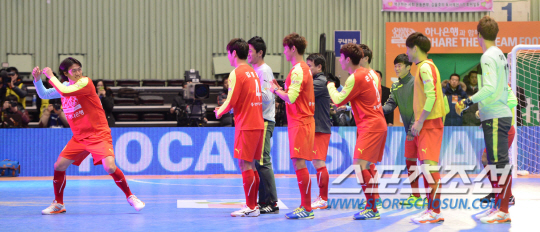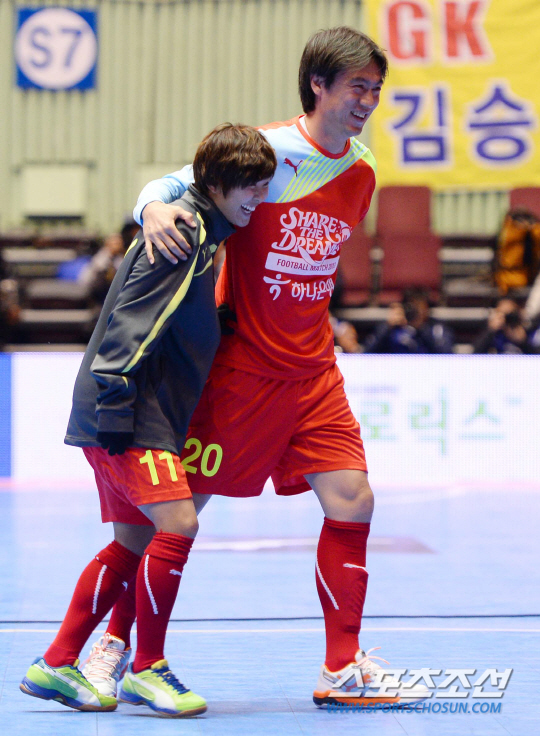 29일 잠실실내체육관에서 홍명보 자선 축구대회 '셰어 더 드림(Share the Dream) 풋볼 매치 2013'가 열렸다. 이번 11회 자선행사에서는 K리그 올스타인 희망팀과 해외리그 올스타 사랑팀의 맞대결로 펼쳐졌다. 희망팀에는 이번 시즌 K리그 최우수선수인 김신욱과 정대세 등이 포진했고, 사랑팀은 독일 분데스리가에서 활약 중인 손흥민과 구자철 등이 주축을 이뤘다. 전반 사랑팀 김영권의 선취골 때 홍명보 감독이 장풍 세리머니를 펼치고 있다. 잠실실내체= 김경민 기자 kyungmin@sportschosun.com / 2013.12.29.