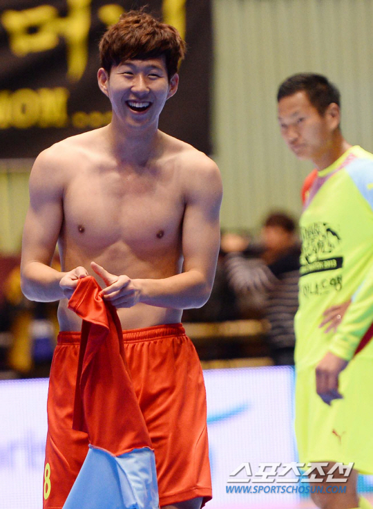 홍명보 장학재단이 주최하는 자선축구대회 '쉐어 더 드림 풋볼 매치 2013'이 29일 잠실실내체육관에서 열렸다. 올해로 11회째를 맞은 자선 축구대회는 해외리그 올스타로 이루어진 '사랑팀'과 K리그 올스타로 이루어진 '희망팀'의 대결로 펼쳐졌으며 행사 수익금은 소아암 어린이들의 치료기금으로 쓰일 예정이다. 골을 넣은 사랑팀 손흥민이 익살스러운 세리머니를 펼치고 있다. 잠실실내체=최문영 기자 deer@sportschosun.com