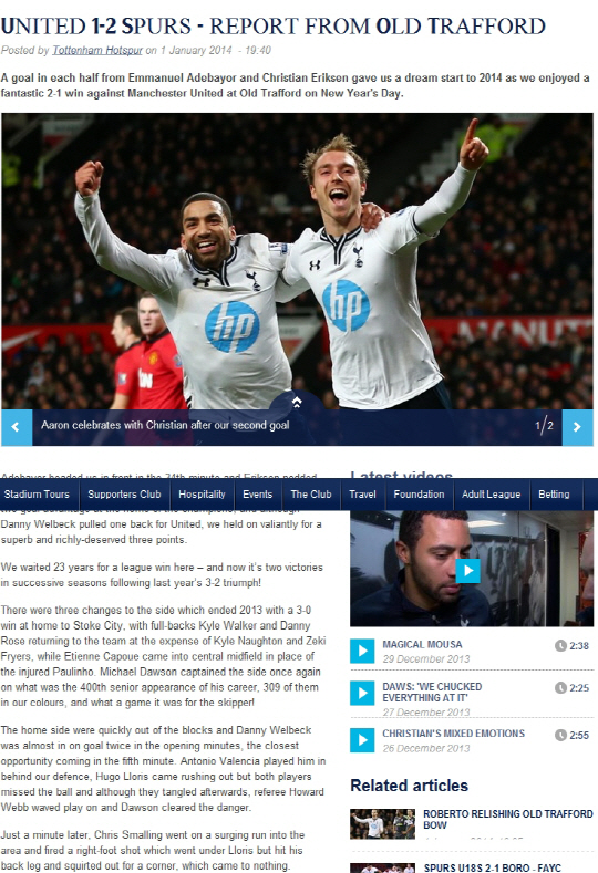 맨유는 2일(한국시각) 올드트래퍼드에서 열린 토트넘과의 2013~2014시즌 잉글랜드 프리미어리그(EPL) 20라운드 홈경기에서 1대2로 졌다. 4연승을 달리던 맨유는 상승세였다. 경기 초반 슈팅을 날리며 좋은 모습을 보였다. 하지만 일격을 당했다. 전반 34분 크리스티안 에릭센이 오른쪽에서 올린 크로스를 엠마누엘 아데바요르가 헤딩골로 연결했다.