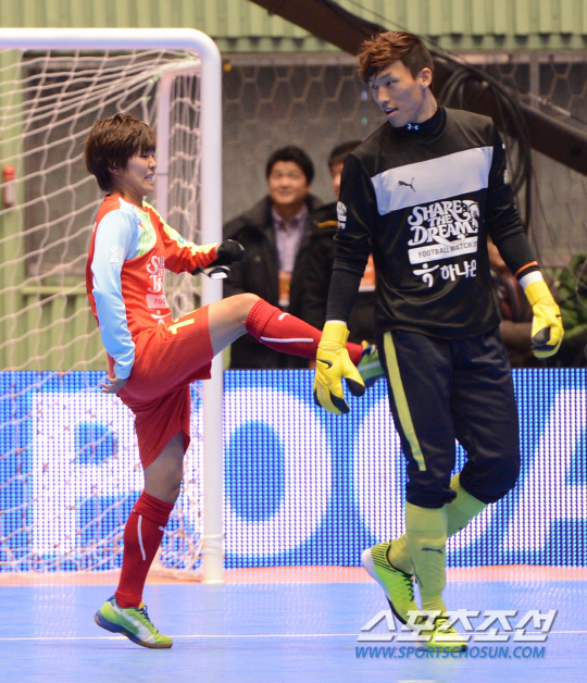 29일 잠실실내체육관에서 홍명보 자선 축구대회 '셰어 더 드림(Share the Dream) 풋볼 매치 2013'가 열렸다. 이번 11회 자선행사에서는 K리그 올스타인 희망팀과 해외리그 올스타 사랑팀의 맞대결로 펼쳐졌다. 희망팀에는 이번 시즌 K리그 최우수선수인 김신욱과 정대세 등이 포진했고, 사랑팀은 독일 분데스리가에서 활약 중인 손흥민과 구자철 등이 주축을 이뤘다. 경기가 끝난 후 지소연(왼쪽)이 김승규의 엉덩이를 차며 장난치고 있다. 잠실실내체= 김경민 기자 kyungmin@sportschosun.com