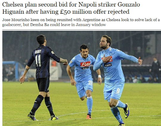 첼시는 이미 이구아인 영입을 나폴리에 제안했었다. 이구아인의 몸값으로 5000만파운드(약 867억원)를 제시했다. 그러나 돌아온 답은 '노'였다. 나폴리는 이구아인이 이미 레알 마드리드에서 무리뉴 감독을 경험한 적이 있어 첼시 이적에 부정적이라는 의견을 내놓았다.