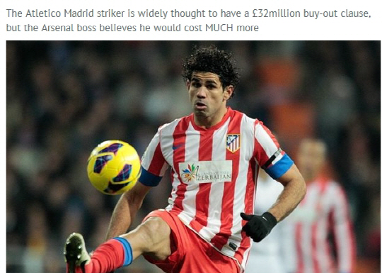 벵거 감독은 4일(한국시각) 영국 일간지 데일리미러를 통해 "코스타의 몸값은 1억4500만파운드다. 아틀레티코 마드리드는 올시즌 가능한 최고의 기회를 잡고 싶어할 것이다"고 했다. 코스타의 바이아웃은 3200만파운드로 알려져있지만, 1억4500만파운드의 이적료는 프리메라리가와 유럽챔피언스리그에서 순항중인 아틀레티코 마드리드가 코스타를 팔지 않을 것이라는 벵거 감독의 생각에서 비롯된 금액으로 보인다.