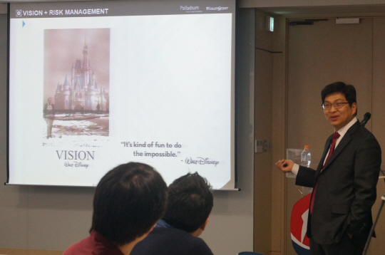 리스크 매니지먼트에 대한 강의에서 김 이사는 "RISK를 받아드리기 위해서는 프로젝트와 이해관계가 얽히지 않은 전문가 집단이 필요하다. 그들이 갖는 '질문'을 통해 RISK를 받아들이게 해야한다"라고 말한 후 "사람은 누구나 실수할 수 있으며, 리스크를 받아드리기 위해서는 교육이나 캠페인이 아니라 좋은 질문을 할 수 있는 사람이 있어야 한다"라고 주장했다.