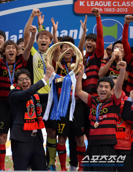 ◇황선홍 포항 감독과 포항 선수단이 지난해 12월 1일 울산월드컵경기장에서 가진 울산과의 2013년 K-리그 클래식 최종전에서 승리한 뒤 우승트로피를 들고 환호하고 있다. 울산=허상욱 기자 wook@sportschosun.com