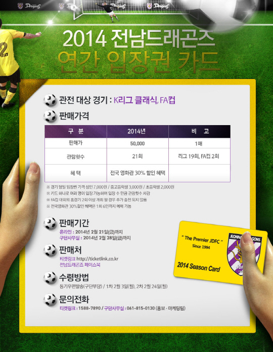 전남은 7일부터 구단 페이스북(http://goo.gl/O6eRbi), 티켓링크(http://goo.gl/jHXISM), 스마트폰(http://goo.gl/6OGXVS)을 통해 2014년 전남드래곤즈의 전 홈경기를 관람할 수 있는 연간 입장권 카드를 판매한다. 바코드 형식의 2014년 시즌권의 가격은 5만원으로, 총 12회의 홈 경기(K-리그 클래식 19경기, FA컵 2경기)를 관전할 수 있다. 카드 하나로 가족, 친구 등 여러 명이 동시 입장도 가능하다. 관람횟수에서 차감하는 방식이다. 2014년 시즌권은 온라인으로는 2월21일(금)까지 오프라인으로는 2월 28일(금)까지 판매한다.