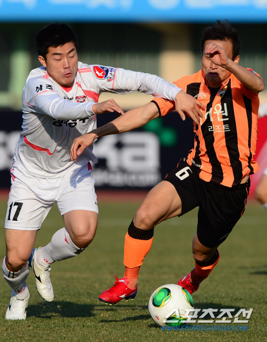 7일 강원도 강릉종합운동장에서 K리그 승강 플레이오프 2차전 상주상무와 강원FC의 경기가 열렸다. 4일 상주구장에서 열린 승강 플레이오프 1차전에서는 상주가 2골을 터뜨린 이상협의 활약을 앞세워 4대1로 크게 이겼다. 상주 이상협(왼쪽)이 강원 진경선의 수비를 제치며 돌파를 시도하고 있다. 강릉=송정헌 기자 songs@sportschosun.com/2013.12.7