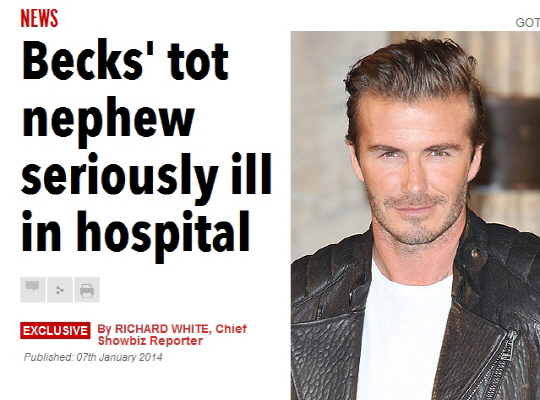 생후 8일된 데이비드 베컴의 조카가 사경을 헤매고 있다.