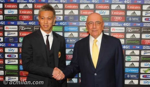 혼다의 입단 기자회견에는 200여명의 취재진이 몰려들었다. 혼다는 30분 간 진행된 기자회견에서 영어로 답하면서 유창한 언어실력을 뽐냈다. AC밀란은 등번호 10번과 일장기, 혼다의 옆모습을 모티브로 삼은 혼다 특별 엠블럼을 선보이는 등 환영의 뜻을 드러냈다. 혼다는 "CSKA모스크바(러시아)에서 보낸 4년의 시간을 바보 취급할 수는 없다"며 "아직까지 만족할 만한 경험이 없었다. 이를 위해 노력하고 싶다"고 선전을 다짐했다.