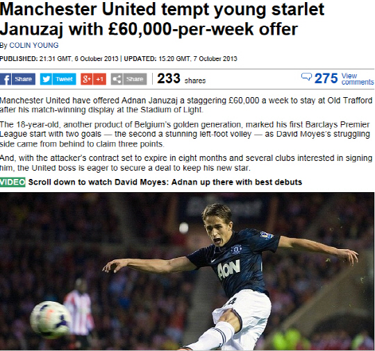 미드필더 아드낭 야누자이(19·벨기에)의 발견이다. 2선 지원 뿐만 아니라 직접 마무리 까지 가능한 공격 본능과 뛰어난 패스 감각, 개인기 등 '제2의 호날두'로 불리울 정도로 좋은 모습을 보여주고 있다. 12일 스완지와의 맞대결에서 2대0 완승을 이끄는 등 활약을 이어가고 있다. 데이비드 모예스 맨유 감독은 경기 후 기자회견에서 야누자이를 극찬했다. 그는 "누구의 눈에도 야누자이의 재능은 분명하다. 어떤 포지션에서도 플레이 가능한 선수"라며 "재능과 기술은 의심할 여지 없이 높은 수준이다. 머지 않은 미래에 최고의 선수가 될 것"이라고 내다봤다.