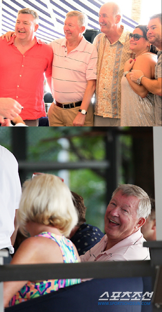 12일(한국시각) 포착된 사진에서 퍼거슨 전 감독은 과거 경기나 훈련에서는 전혀 발견할 수 없었던 행복감에 젖은 표정을 짓고 있다.